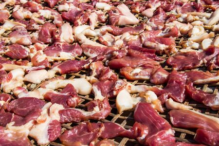 Preserving pork meat by dry with Sun-dried on bamboo basket weave palat.