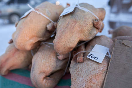 Carcasses of frozen goose on the counter. Selective focus.