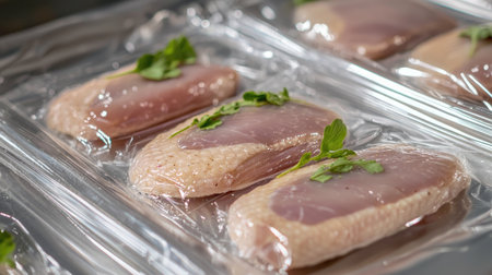 High-quality image of fresh chicken breasts wrapped in plastic, garnished with herbs and citrus. Ideal for culinary, food service, and nutrition-related contexts.