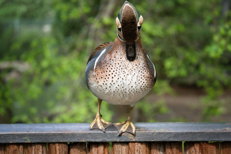 A colorful duck stands on a fence and turns its head to the side. The background is blurred and shows green nature in spring or summer.