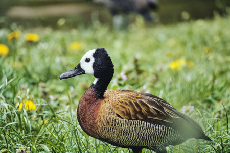 White-faced whistling duck, Dendrocygna viduata, noisy bird with a clear three-note whistling call at the lake. Close up. Side view. Nature landscape. Bird watching