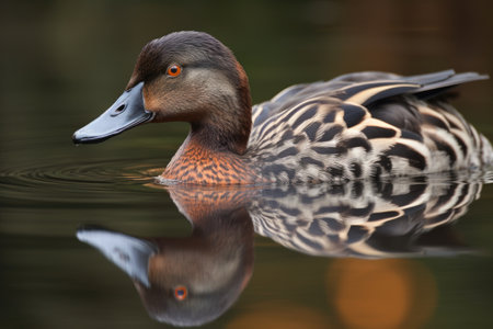 close-up of a large duck, with its reflection visible in the still waters, created with generative ai