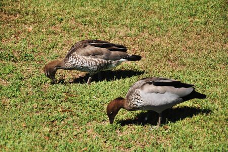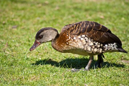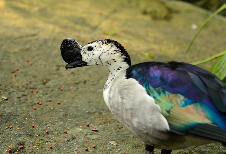 An exotic Australian duck beaking down on the ground