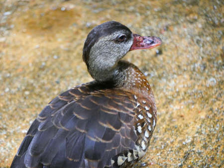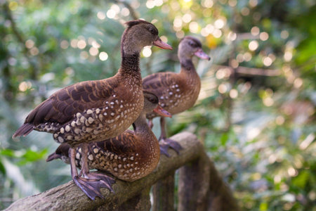 The whistling ducks or tree ducks brown color with white spots standing on a stump in tropic rain forest. Closeup