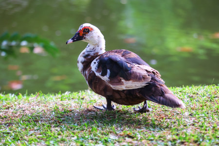 Muscovy duck stands on a grassy bank near the water
