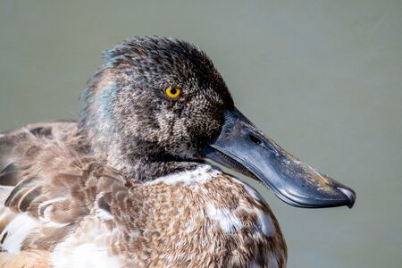 A closeup of a male northern shoveler's face. Vancouver BC Canada