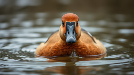 a duck stands in the rain, its feathers adorned with raindrops. this national geographic photo captures the duck's exaggerated facial features in the style of explosive pigmentation, reminiscent of peter paul rubens' art. taken with a nikon d850, the image showcases a beautiful contrast between the duck's dark orange and light brown colors, reminiscent of the works of albert bierstadt. ai generated