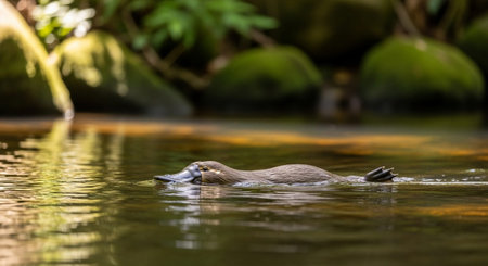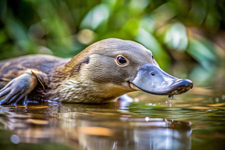 Duck-billed platypus resting in shallow water, vibrant green foliage background