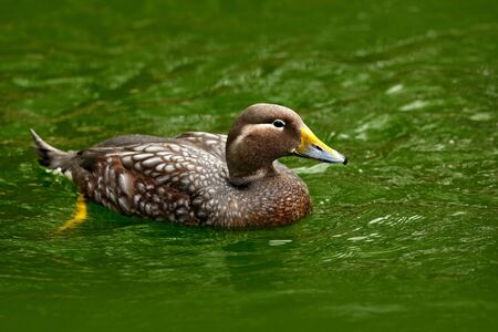 Flying steamer duck, Tachyeres patachonicus, is a member of the duck, goose. It can be found in the Southern part of South America; in Patagonia, Falkland Islands. Wildlife nature.