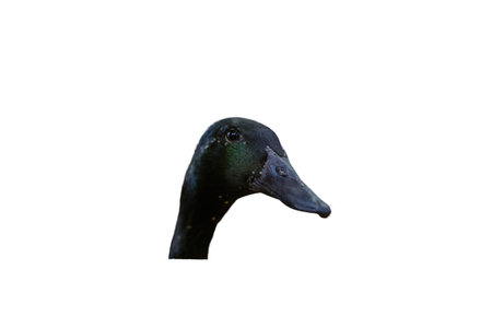 Close up of a black duck head isolated on white background.