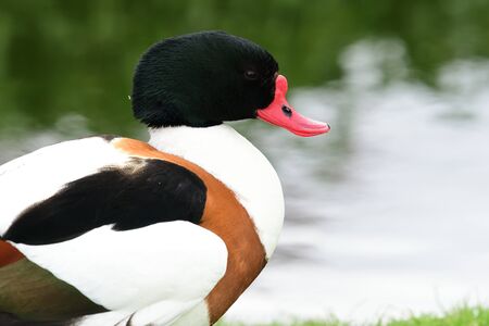 Portrait of a common shelduck (tadorna tadorna) standing by the waters edge