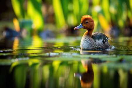 Beautiful duck swimming serenely in a vibrant green pond during a sunny day