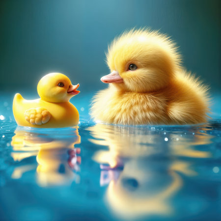 A fluffy duckling and a yellow rubber duck are floating side by side on a calm, shimmering blue surface