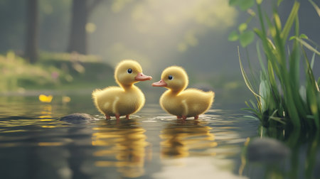 Two charming ducklings enjoy their playful moment in a tranquil pond, surrounded by rich greenery and soft ambient light, showcasing nature's beauty.