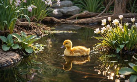 Cute duckling swimming in a serene pond during springtime, surrounded by gentle ripples and natural greenery