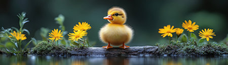 Adorable duckling on a log surrounded by tiny yellow flowers near a pond