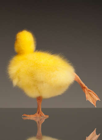 Cute little domestic gosling on grey background