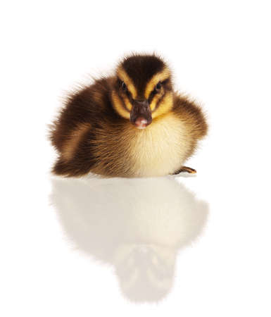 Duckling floating on water in front of a white background