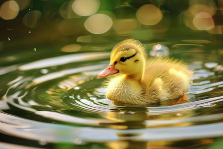 Duckling swimming in a pond with bokeh background, nature and wildlife concept.
