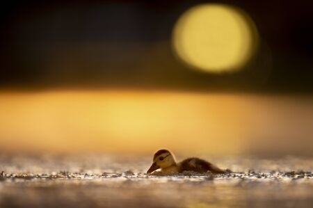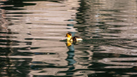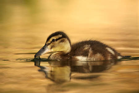 The mallard or wild duck (Anas platyrhynchos) small newborn swimming on the lake. Morning sun. Gold background.