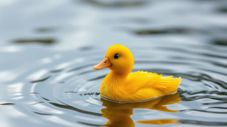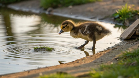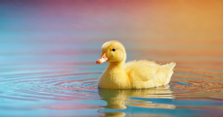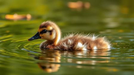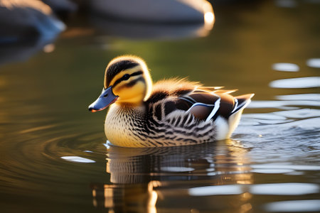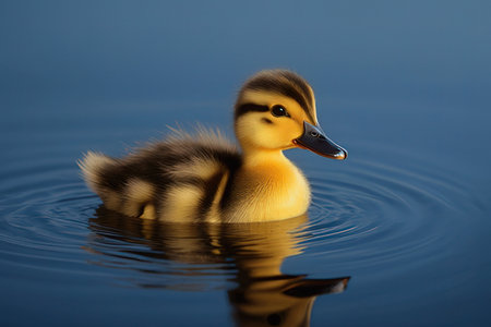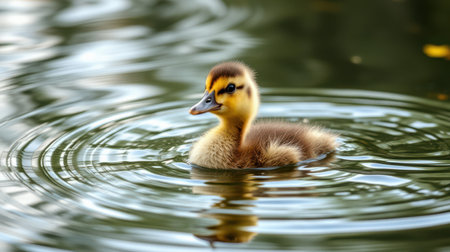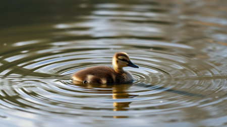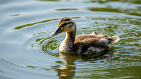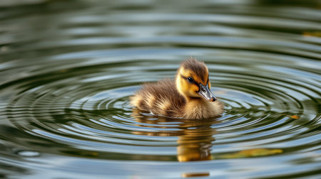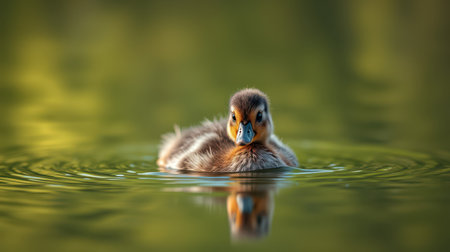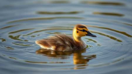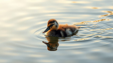 Cute duckling swims peacefully in calm water surrounded by ripples under soft sunlight