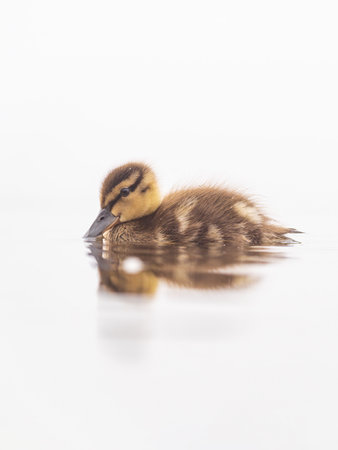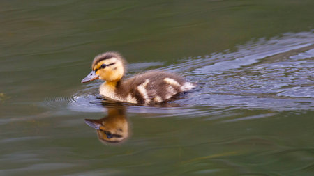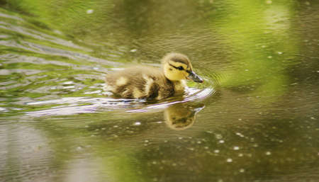 Newborn mallard duckling swimming alone in a pond. High res photo
