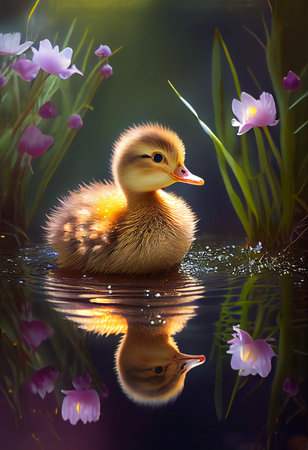 Little duck swimming in a pond with flowers and magical background - AI generated tiny baby goose