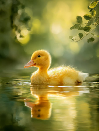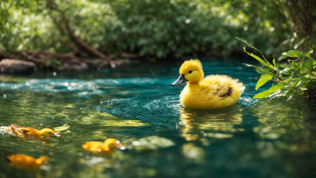 A charming yellow duckling glides serenely across tranquil waters, illuminated by gentle sunlight amid lush green foliage in a peaceful outdoor scene.