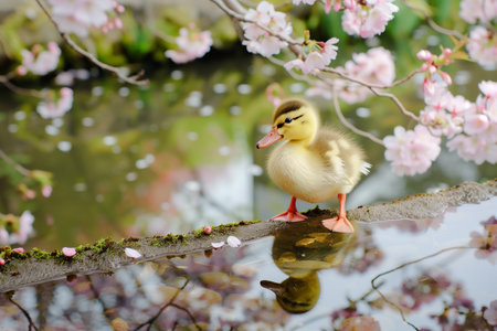 A charming scene of a duckling standing on a mossy branch at the edge of a pond, its reflection clear in the water. Above, cherry blossoms bloom, adding a serene, natural beauty.