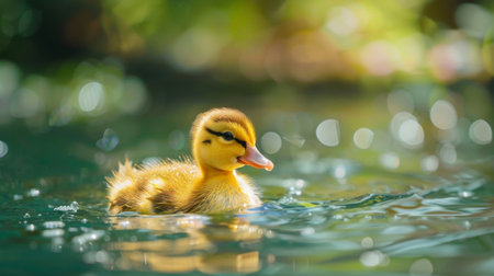 Adorable duckling floating gracefully in serene water with sunlit reflections
