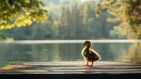 A duckling standing on a wooden dock, gazing curiously at the water, with a serene lake and surrounding trees in the background.
