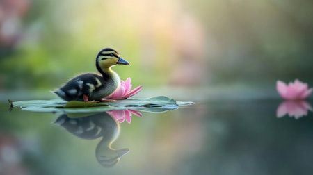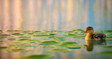 Tiny duckling exploring a pond, serene nature background with large copy space for design.