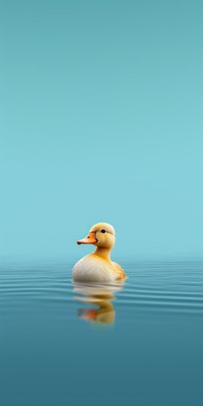 yellow duck floating on a dark blue sea, captured in a photographically detailed portrait. the vibrant colors of dark orange and light aquamarine create a saturated color field, reminiscent of the painterly style found in dutch tradition. this wildlife photograph was taken using the zeiss milvus 25mm f/1.4 ze lens, showcasing the beauty of nature in a visually striking composition. ai generated