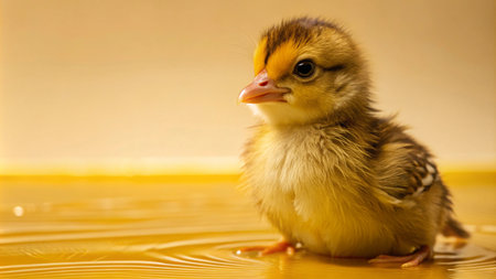 A fluffy yellow chick sits in a shallow pool of water, looking to the side with a curious expression.