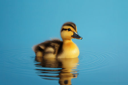Duckling swimming in the water on a blue background with reflection
