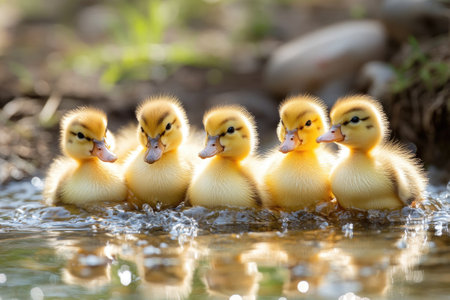 Five adorable yellow ducklings swimming together in shallow water enjoying a sunny day