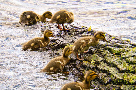 Ducks chicks on a log in the river. Small water birds with fluffy feathers. Animal photo from nature