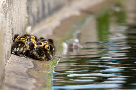Newborn mallard ducklings group beside the edge of a high sided pond with mother duck looking on