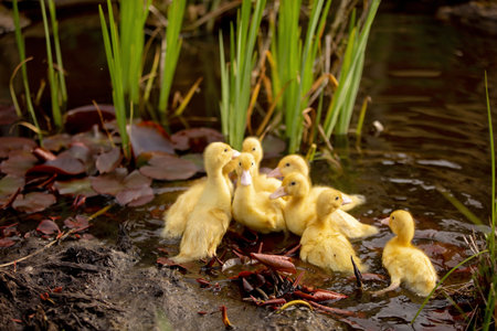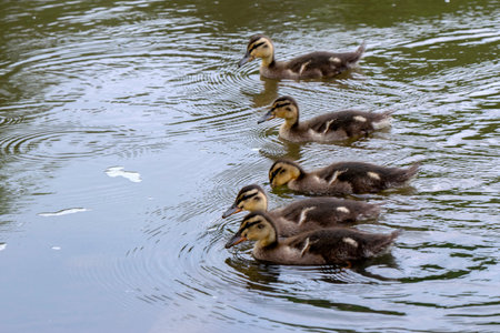 Little ducks swim in a group along the pond. Photo of wild nature.