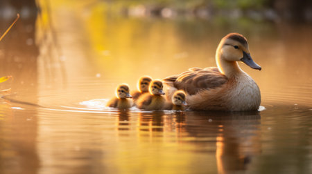 Wild duck family of mother bird and her chicks swimming on lake water at bright sunset. Birdwatching concept