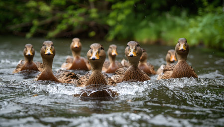 Ducklings swimming together in a stream, enjoying nature and wildlife