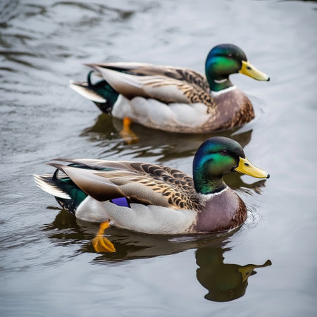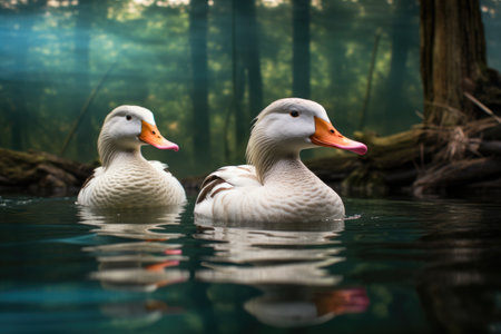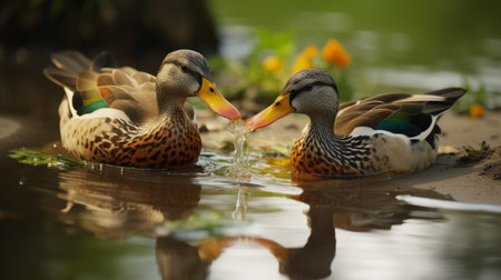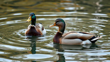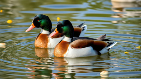 two ducks swimming side by side in a pond, created with generative ai
