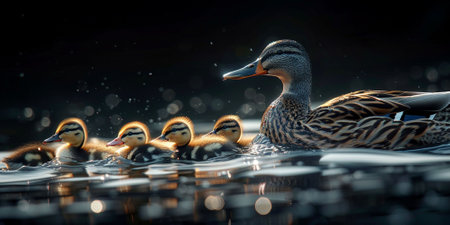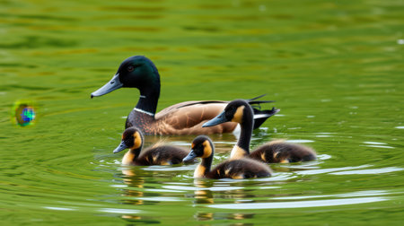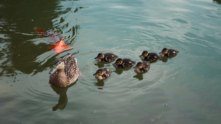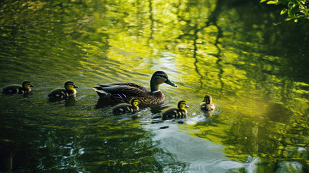Mother duck leads her ducklings through the calm water on a sunny day in a natural park