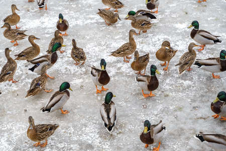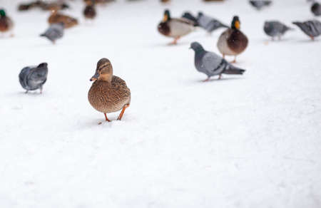 Winter portrait of a duck in a winter public park. Duck birds are standing or sitting in the snow. Migration of birds. Ducks and pigeons in the park are waiting for food from people.