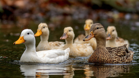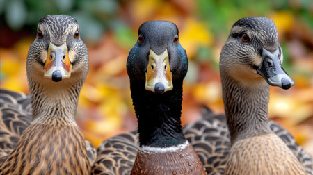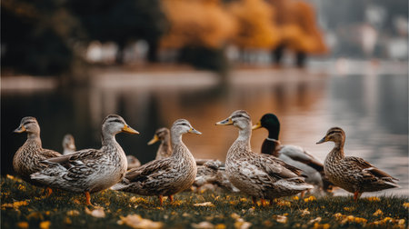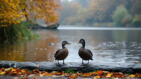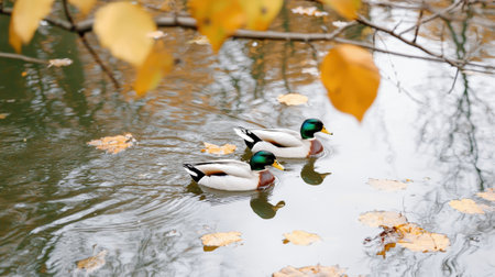 Ducks gliding gracefully on a serene autumn lake, surrounded by golden foliage, offering a picturesque image with copy space