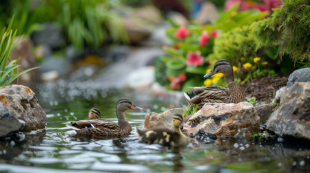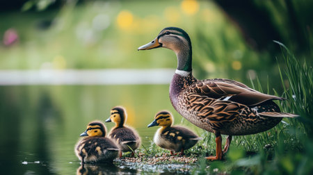 A delightful scene of a mother duck with her ducklings near a peaceful pond, surrounded by lush greenery and colorful flowers, capturing the essence of nature.