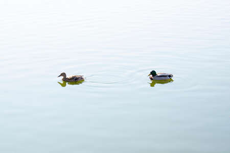pair of ducks in love swims in the lake