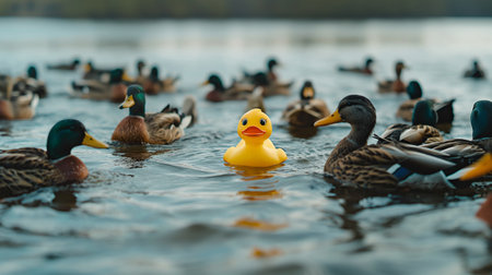 A bunch of ducks are gathered together, with one of them being a yellow rubber duck. The rubber duck is positioned in the middle of the group of ducks, making it stand out from the rest