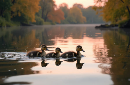 Three ducklings gliding across calm waters reflect the warm colors of dawn as trees in autumn hues frame the serene lake. A peaceful moment in nature captures early light.