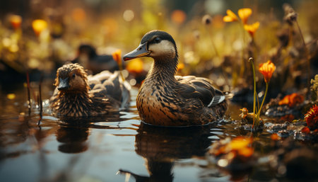 Nature beauty reflected in the tranquil pond, ducks in focus generated by artificial intelligence